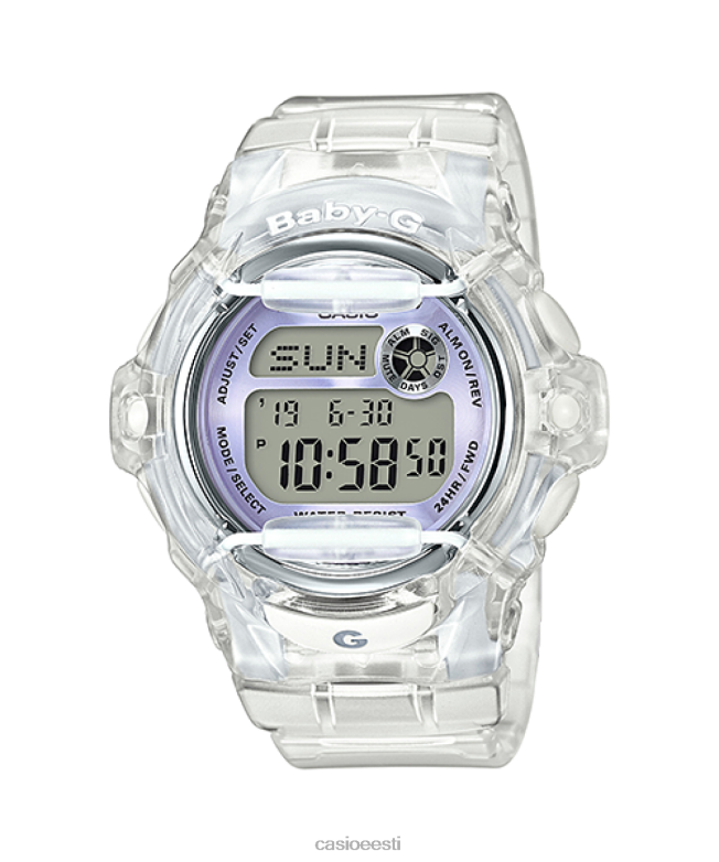 Selle 200-meetrise veekindla baby-g mudeli näol on pilkupüüdvad erksad värvid. metallist sõrmus kombineerituna näokaitsega, et luua nägu, mis on dünaamiline, kuid samas klassikaline baby-g.nii ümbris kui riba on tehtud populaarses poolläbipaistvas selges värvitoonis. ümbrisel olevad traadist näokaitsed võimaldavad muretult kanda rannas, basseinis või muudes suure aktiivsusega kohtades. Funktsioonide hulka kuuluvad päevaloendur, maailmaaeg, telememo ja muud funktsioonid, mis on kasulikud kogu perioodil. päeval.