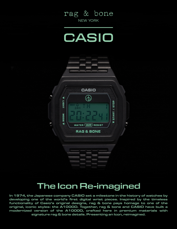 Brändi 20. aastapäeva tähistamiseks on rag & bone teinud koostööd Jaapani ajanäitajabrändiga Casio, et luua tootesarja, mis ühendab uuendusliku kelladisaini rag & bone'i jäljendamatu kesklinna laheda kaubamärgiga. 2022. aasta sügisel turule tulevatel uutel ajanäitajatel on monokromaatiline riba ja korpus, mis on mõlemad töödeldud sõjaliste aktsentvärvidega, ning viierealine massiivne metallrihm, mis tagab pikaajalise mugavuse. Casio ühel varasemal digitaalsel kellal põhineb a1000 kaheksanurkne ümbris ja kannab mugavalt, õhukese profiiliga. näo keskel asuv LCD-ekraan kuvab kellaaega selgelt, pakkudes samas ruumi mitmete lisa- ja kasulike funktsioonide jaoks, sealhulgas kuupäev, stopper ja äratus. kõiki seadistusi juhitakse kolme mugava nupuga korpuse külgedel. see koostöö näitab mõlema kaubamärgi pühendumust ajatule, funktsionaalsele disainile. (kaltsu ja luu kohta) alates selle päritolust New Yorgis 2002. aastal on rag & bone end tõestanud kriitilise ja ärilise eduna.rahvusvaheline moemaailm. Ühendades inglise pärandi suunava disainiga, on bränd muutunud kaasasündinud kantavate rõivaste sünonüümiks, millel on närviline, kuid alahinnatud new yorki esteetika. rag & bone pakub täielikku valikut meeste ja naiste valmisrõivaste, teksade, aksessuaaride ja jalatsite kollektsioone.