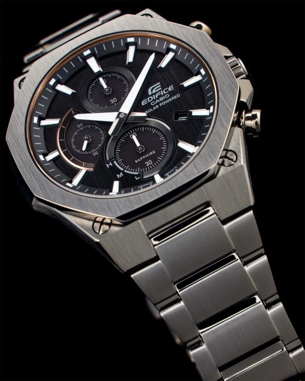 õhuke päikeseenergial töötav kronograaf safiirkristalliga | kuigi mitme käega kronograafi korpused kipuvad olema paksud, on see päikeseenergial töötav kronograaf, mille korpuse paksus on 9,7 mm, et tagada parem sobivus. kellal on lame kaheksanurkne raam, mille juuksepiiri viimistlus loob sportliku, kuid luksusliku disaini. kasutab kriimustuskindlat safiirkristalli. ümbrise ja riba kombinatsioon, millele on antud kriimustuskindlust tagav must ioonplaat ja punane aktsentvärv, loob julge kujunduse.