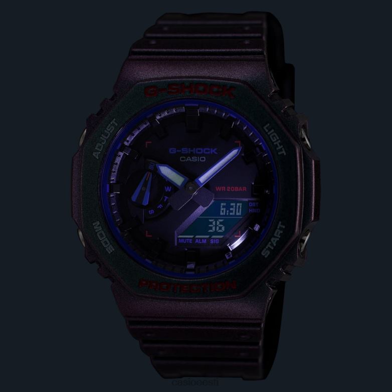 Neile, kes sihivad kõrgemat virtuaalmaailmas – ja päriselus!tutvustame g-shocki, mis on inspireeritud sihikindlusest, mida on vaja arvuti- ja ellujäämismängude kõrgeimatele tasemetele jõudmiseks. Mängijad teavad, mida on vaja märuli- ja tulistamismängudes kõrge tulemuse saavutamiseks. need kellad taasloovad põneva, pidevalt muutuva mängumaailma polariseeritud lilla ja rohelise värviga, mis muudab värvi sõltuvalt vaatenurgast. detailid, nagu sihiku sihtmärk sihtmärgile suunamiseks, on ühendatud oranžide aktsentidega ja LCD-ekraani graafikaga, et luua mänguline kujundus, mis liigub sujuvalt reaalse ja virtuaalse maailma vahel. vali oma lemmik – kaheksanurkne ga2100ah või klassikaline Bluetoothiga digitaalne dwb5600ah
