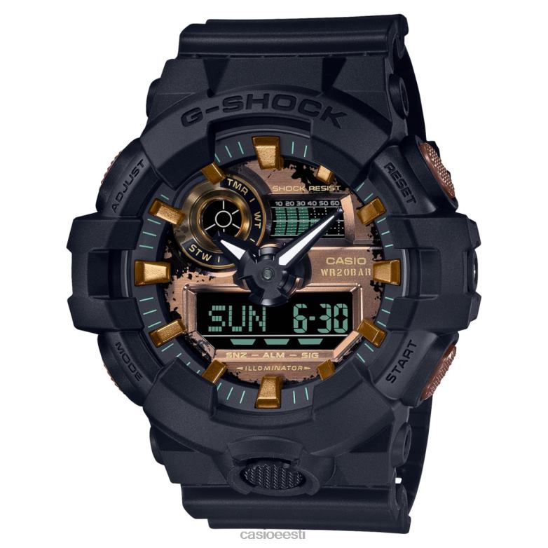 tugevdage oma välimust g-shockiga disainiga, mis meenutab roostetanud rauda, mis peab vastu ajaproovile. Need kellad avaldavad austust surematule g-shocki püüdlusele saavutada neoklassikaliste mustade ja roosteta disainilahenduste ülim vastupidavus, mis kutsub esile roostetanud rooste vastupidavuse. raud.seepia toonid, mis on inspireeritud roostetanud metalli tekstuursest välimusest, täiendavad kenasti alusmusta. helesinised aktsendid loovad maalähedase hõnguga ajatu stiili.