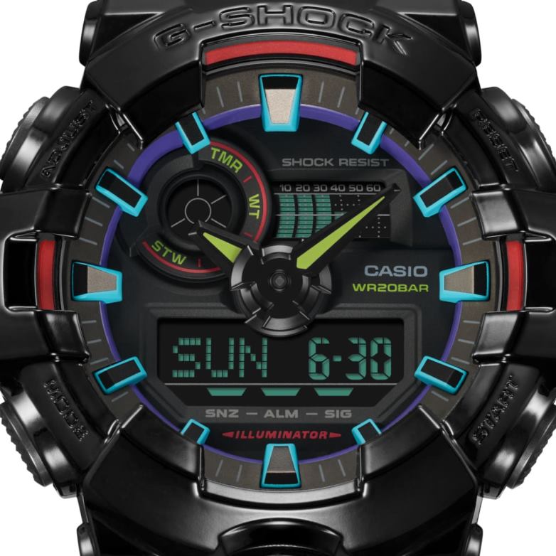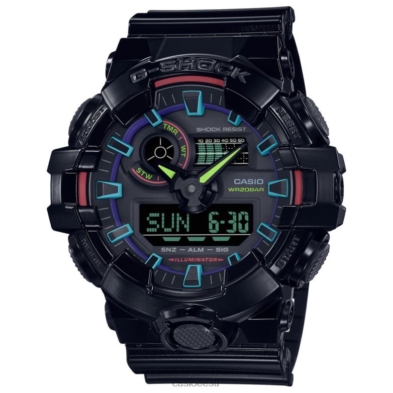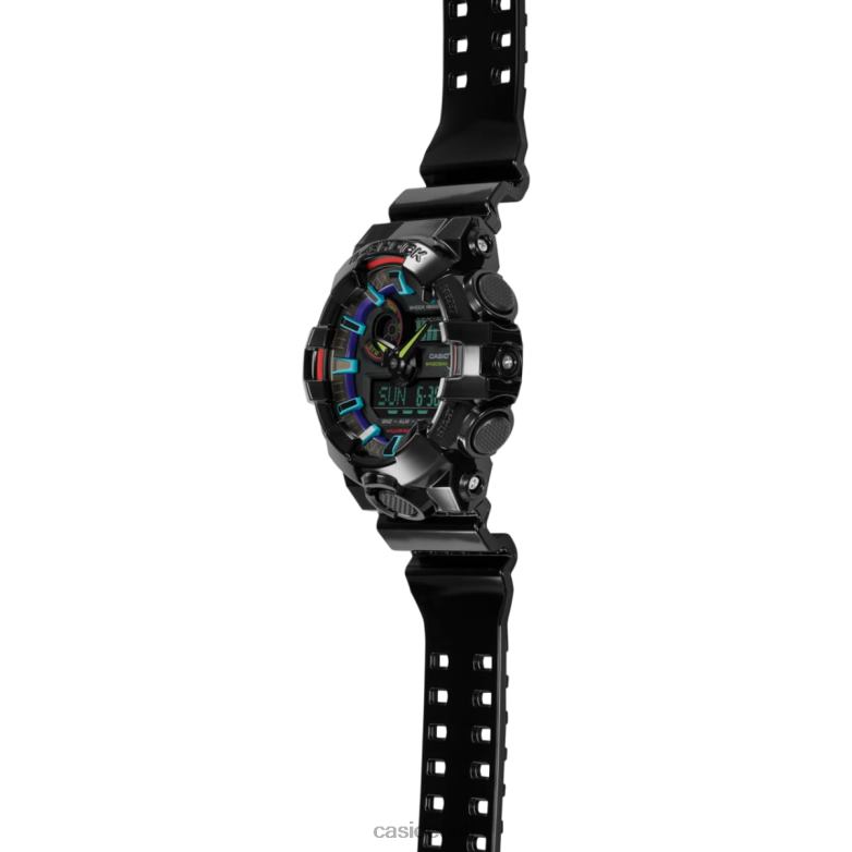 Astuge tutvuma virtuaalse vikerkaarevalikuga – uurige värvilist spektrit, mis tekib siis, kui kübertehnoloogilise mängumaailma esteetika kohtub g-shocki püüdlustega ülima sitkuse poole. Äärised ja ribad toovad kaasa läikiva musta värvi, samal ajal kui nägudel on vikerkaare aurukiht. ja mitmevärvilised kujundused. Tulemuseks on rida julgeid pilke jahedate värvidega prismades, mis valgustavad pimedust, mis muserdab igas moepildis.