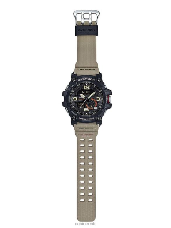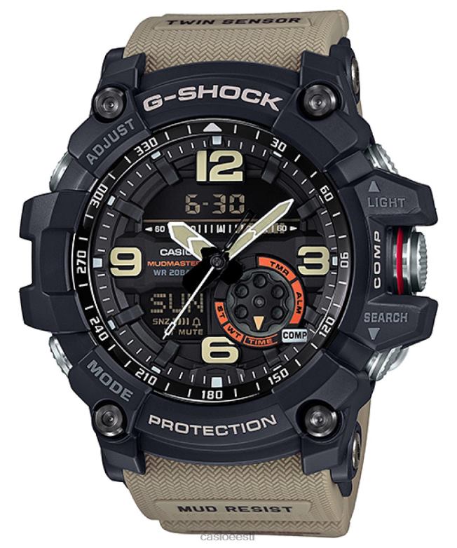 See on kahe sensoriga mudel g-shock mudmasteri seeriast, mis on mõeldud kasutamiseks ekstreemsetes keskkondades, kus on killustikku, mustust ja prahti. ühe suure nupuvajutusega kella 3 asendis saate oma asukohta selle kompassiga kontrollida. temperatuuri saab mõõta ka lihtsalt kell 4 nupule vajutades. see mudel on välja töötatud töövõimet silmas pidades, et igaüks saaks ilma visuaalse vaatluseta oma asukohta kompassi abil intuitiivselt kontrollida isegi kõige äärmuslikumas kliimas. tolmu- ja mudakindel nupukaitse silindri struktuur takistab peene liiva ja muda sattumist nuppudesse, aidates samal ajal neelata nuppudele saadavaid lööke ja parandades töövõimet. Nähtavuse parandamiseks on kasutusele võetud ka laiad tunni/minutite osutid ja suurte araabia numbrite indeksid. see disain on täis sõjaväestiilis helki, sealhulgas režiimiekraan, mis kasutab ketirattast inspireeritud ketasketast ja tekstureeritud riba, et vältida libisemist.
