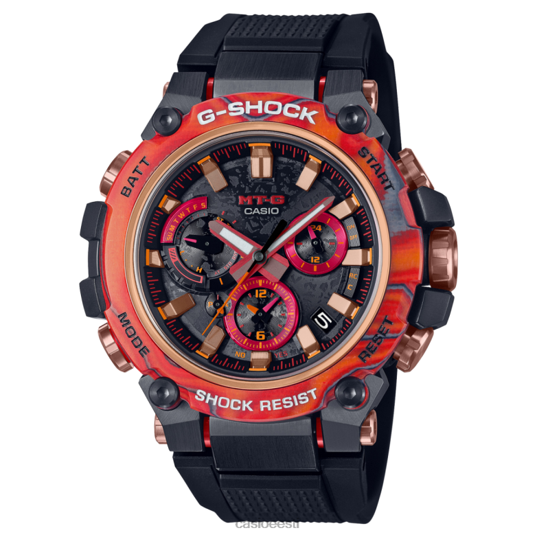 Tutvustame g-shocki 40. aastapäeva plahvatuspunast – tulise värvi purse kahes piiratud väljalaskega ajanäitajas, millega tähistatakse 1983. aasta g-shocki debüüdi 40. aastapäeva. Mtg-b3000 on inspireeritud päikesepõletuse intensiivsest võimsusest ja gwg-2000 mõlemad kiirgavad g-shocki musta ja punast värvi, pakkudes casio parimaid uusi tehnoloogiaid. Mitmevärviline süsiniku sisendiga raam, mis on valmistatud fosforestseeruvaid osakesi sisaldavatest süsinik- ja klaaskiudlehtedest, kutsub esile päikese tohutu plahvatusjõu. pind, mis annab ajanäitaja, mis kiirgab pimedas helendavat ilu. üksikute ja unikaalse mustriga raami komponendid – pole kahte ühesugust – annavad tulemuseks tõeliselt ainulaadsed kerged, tugeva tugevusega kellad. Tõstke see veelgi kõrgemale gwg-2000 esipaneeli komponentidega, mis on valmistatud sepistatud süsinikkiust koos fosforestseeruvate osakestega, mis sobivad kokku pimedas helendavate päikesekiirte mustritega raam. Mõlemal mudelil on sihverplaadile trükitud päikesekiirte muster ja eriline udukujuline disained logo, mis tähistab ümbrise tagaküljele graveeritud g-shocki 40. aastapäeva ja riba aasale graveeritud neli tärni 40 eest. Need hoolikalt kaunid, kordumatult mõjuvad ajanäitajad on täpselt sobivad g-shocki 40. aastapäeva tähistamise alustamiseks.