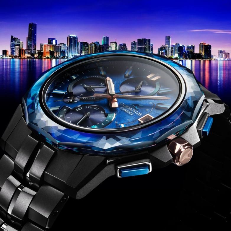 Safiirikristalli lõikab käsitsi juveeli poleerija, et luua raam, mis peegeldab valgust keerukalt nagu mere säde. lõiget ja disaini juhendas isiklikult kazuhito komatsu, Jaapani käsitööline, kes juhib üht maailma juhtivatest töökodadest. juhuslikud, kuid harmoonilised lõikepinnad on tõeline kunstiteos, mida toetavad kogemused ja tundlikkus. töömahuka ja aeganõudva protsessi tõttu toodetakse iga päev vaid paar tükki ja igaüks neist särab ainulaadse esemena. Paksul safiirkristallil on kasutatud 24 tahulist lõiget. pärast vääriskivide poleeriga lõikamist graveeritakse lasertöötlusega peen juuksepiiri sarnane muster, mille tulemuseks on valgust keerukalt peegeldav viimistlus. Lisaks täiustab värvi gradatsiooniline aurustamine-sadestamine ja pihustustöötlus, mis muutub helesinisest siniseks. Sihverplaadi moodustamiseks kasutatav vorm kasutab ümberkristallitud titaani, mida on kuumtöödeldud, et luua selle pinnale kristallmuster. kasutades täiustatud mold ülekandetehnoloogia, vormi peen tekstuur on sihverplaadil reprodutseeritud. lisaks on see värvitud gradatsioonivärviga, mis muutub helesinisest siniseks, kasutades aurustamise-sadestamise protsessi. roosa kulla aktsentvärv on kantud kõikjale, et väljendada mere sära, kus paistab linna valgus.