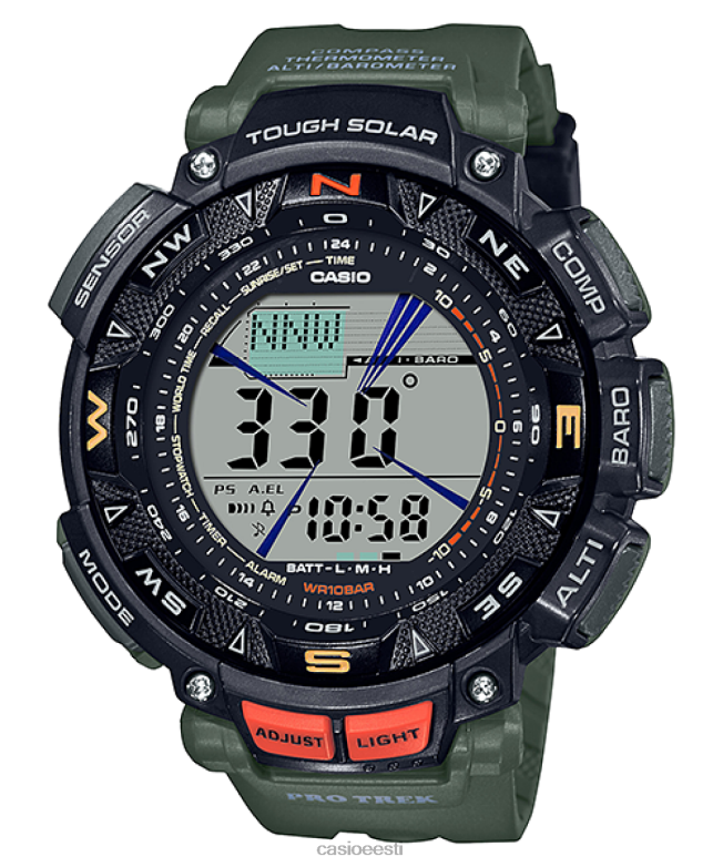 Tutvustame uusi vastupidavaid päikeseenergia ja kolmekordse sensoriga prg-240 mudelivärve tõsiste välitingimustes kasutatavate kellade professionaalsete trekivaliku jaoks.khaki ja liivabeeži maatoonides värvilised ribad loovad välitingimustes kasutatavate kellade jaoks ideaalse välimuse. Oranžid ja kollased värvid, mida kasutatakse kaks esinuppu ja inkrusteeritud raami tekst valiti nende parema nähtavuse huvides.kahekihiline LCD, mis suudab samaaegselt kuvada erinevat tüüpi andmeid, kombineerib registrirõngaga lihtsa laagrinäidu jaoks loob praktilise disaini.kahekihiline vedelkristall silmapaistva mitmekülgsuse tagamiseks on võimalik näidata sinist kompassi kursorit, mis on kaetud praeguse ajamõõtmise ekraaniga. Kompassi, õhurõhu/kõrguse ja temperatuuri mõõtmise funktsioonid saavad toite tugevast päikesesüsteemist, mis hoiab funktsioonid töökorras isegi väikese koguse kerge. Suurte nuppude uuenduslik paigutus, mis käivitavad kompassi, õhurõhu/kõrguse ja temperatuuri mõõtmise võimaldavad ühe nupuvajutusegach töö isegi kindaid kandes.Nööpide kaitsed katavad nuppude välispinnad vaiguga, mis hoiab ära väärkasutamise.Lisaks sellele, et need prg-240 mudelid on praktilised ja väga funktsionaalsed, on need loodud sobima hästi ka tänapäevase välismoega. kolmekordne andur: laager, õhurõhk/kõrgus, temperatuur vastupidav päikeseenergia madala temperatuuriga spetsifikatsioonid (-10 kraadi Celsiuse järgi/14 Fahrenheiti) 100-meetrine veekindlus laagriraam